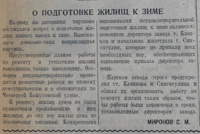 Автор заметки Миронов С.М. пишет, что предусмотренные планом работы по ремонту и утеплению жилья выполнены лишь наполовину, до сих пор дома не были обеспечены топливом. Также были названы конкретные виновники неудовлетворительной подготовки к зимнему периоду – это помощник директора завода Клопков и начальника жилотдела Сингатулин, которые не приняли меры, обеспечивающие выполнение приказа директора завода.