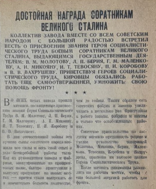 «Коллектив завода вместе со всем советским народом с большой радостью встретил весть о присвоении звания Героя Социалистического Труда боевым соратникам великого Сталина, выдающимся государственным деятелям: В.М. Молотову, Л.П. Берия, Г.М. Маленкову, А.И. Микояну, И.Т. Тевосяну, П.И. Коробову и В.В. Вахрушеву. Приветствуя Героев Социалистического Труда, кировцы обязались работать еще самоотверженней, умножить свою помощь фронту!», - сказано в заметке.