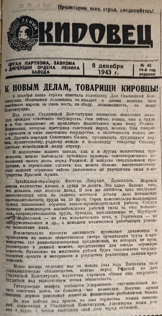 5 декабря 1943 года страна отмечала очередную годовщину принятия Сталинской Конституции. Это событие нашло отражение и на страницах заводской газеты «Кировец» Московского электромашиностроительного завода «Динамо» в номере от 8 декабря того года.