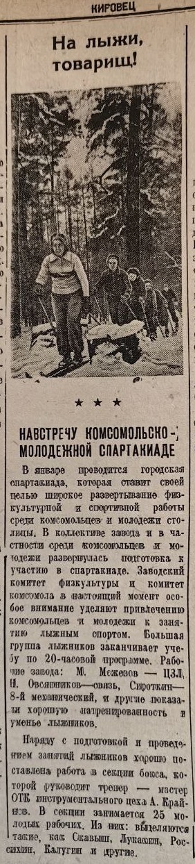 «Заводской комитет физкультуры и комитет комсомола в настоящий момент особое внимание уделяют привлечению комсомольцев и молодежи к занятию лыжным спортом. Большая группа лыжников заканчивает учебу по 20-часовой программе», - отмечено в газетной публикации.